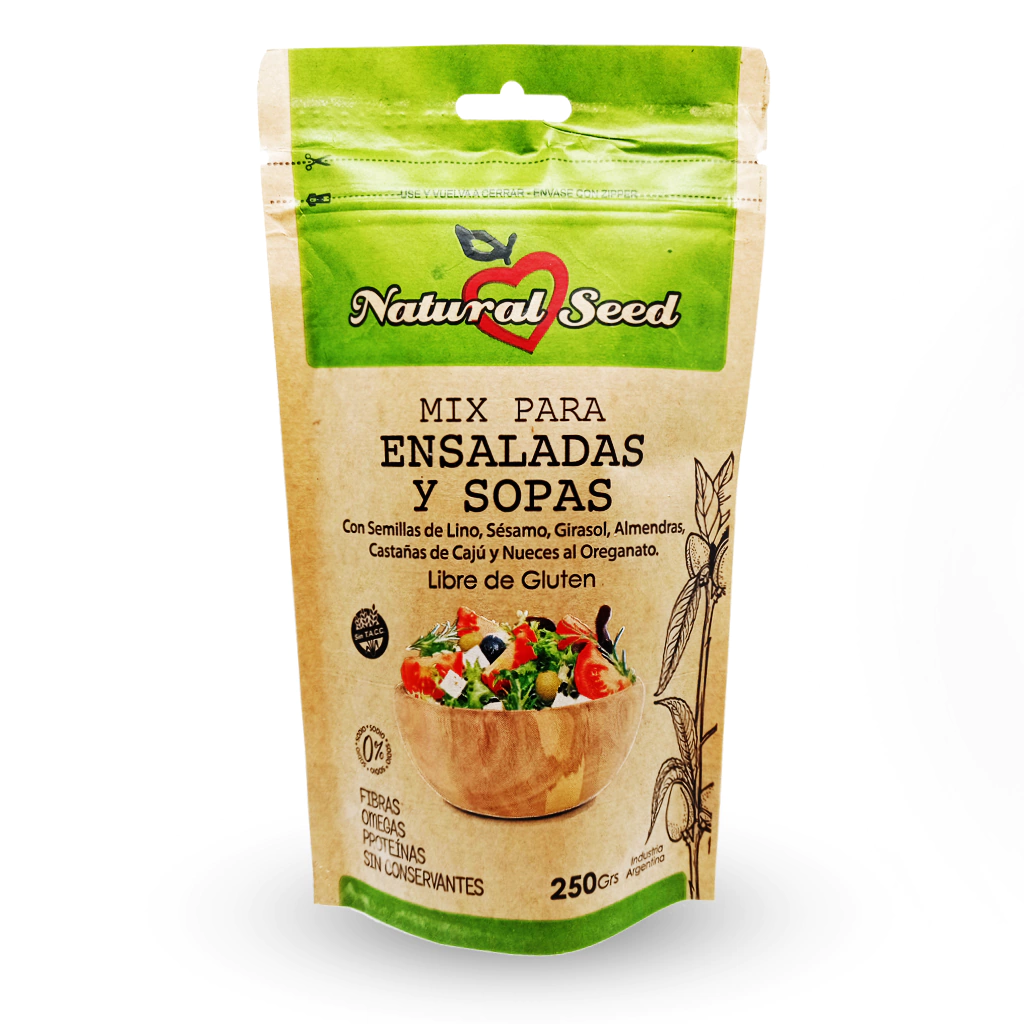 Mix enriquecedor de ensaladas y sopas, contiene 3 frutos secos + 3 semillas al oreganato. logo sin taccAlimento rico y natural, ideal para llevar al trabajo o comer en casa, para quienes quieran agregar nutrición diaria a sus comidas, agregando 2 o mas cucharadas a gusto, aporta ácidos grasos esenciales, vitaminas del complejo B, y minerales como hierro, potasio, zinc magnesio y cobre. Provee proteínas de alta calidad, y alto contenido de vitamina E por sus frutos secos y semillas